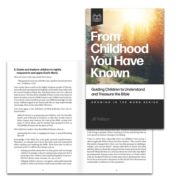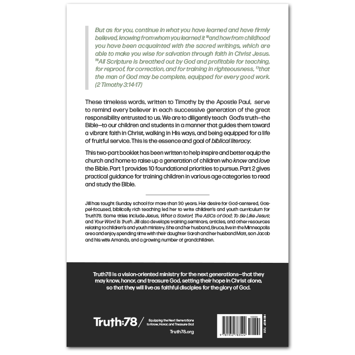 This two-part booklet has been written to help inspire and better equip the church and home to raise up a generation of children who know and love the Bible. Part 1 provides 10 foundational priorities to pursue. Part 2 gives practical guidance for training children to read and study the Bible in various age categories.