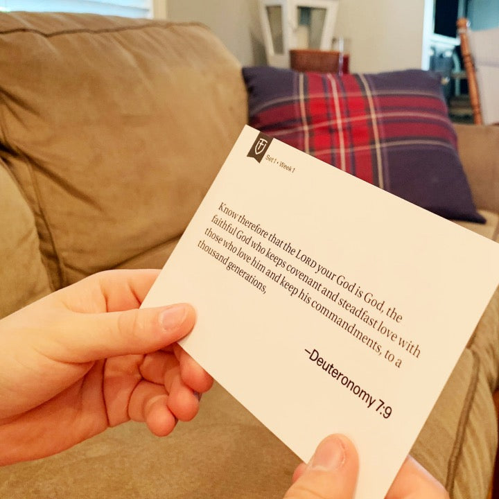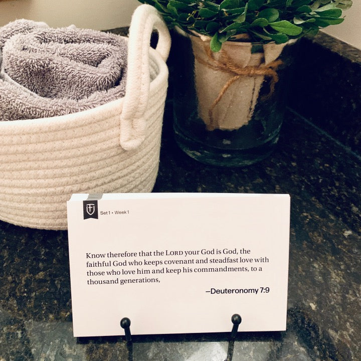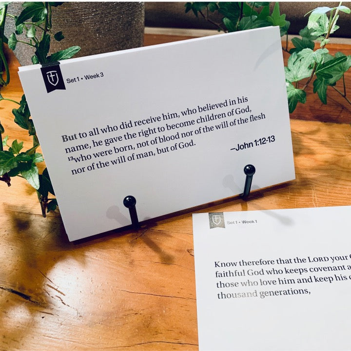 Now available as 4x6 double-sided cards, the Fighter Verses are attractive and easy to display. Whether you prop them on your kitchen counter or windowsill, beside your bathroom mirror, on your desk, or near your favorite chair, keeping them in sight can help you review and meditate on each week’s passage.